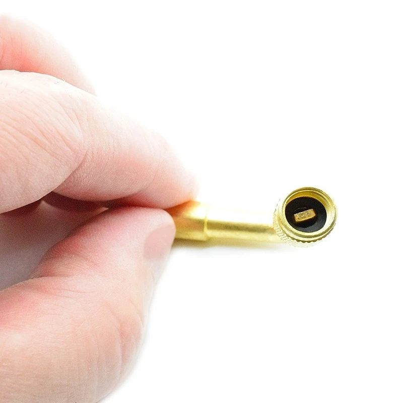 Adaptateur coudé laiton avec bouchon pour valve Schrader de vélo.