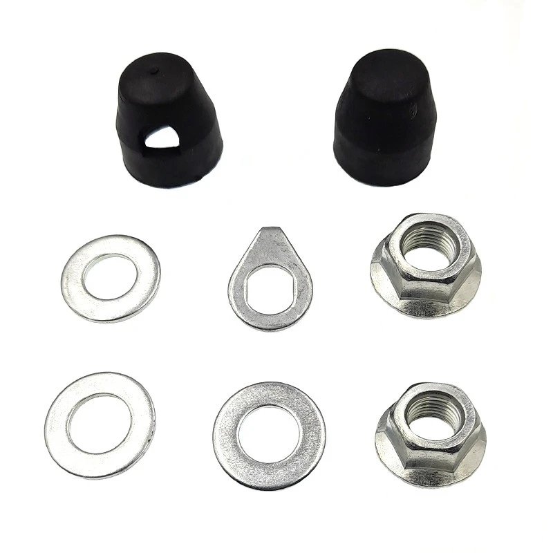 Ensemble de visserie incluant des écrous, rondelles, boulons et capuchons de protection pour roue avant.