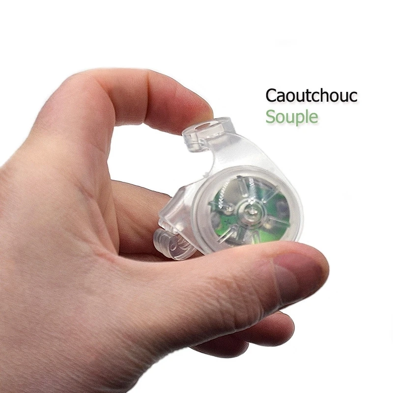 Cette lampe est alimenté par une pile bouton CR2032 et dispose de 3 modes d’éclairages : Fixe, clignotant rapide, clignotant lent.