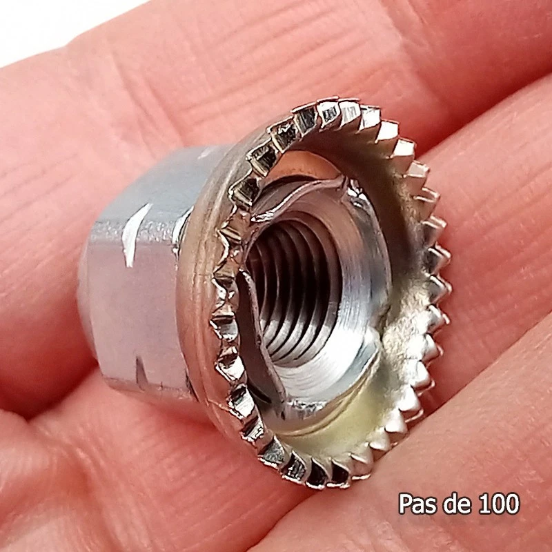Ce boulon à embase rotative dentelée de la marque ALGI sert à maintenir fermement l’axe de la roue du vélo. Cet écrou évite d’avoir à disposition une rondelle à ajouter sur entre le cadre et l’écrou.