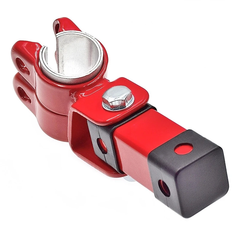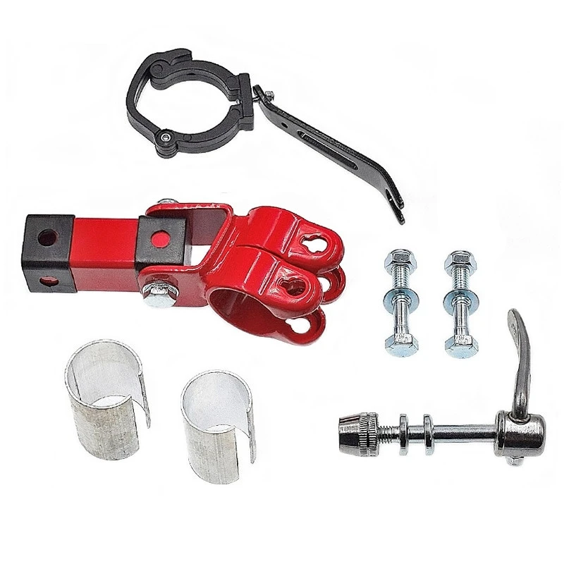 Ce kit complet comprend un collier d’attelage en acier qui se fixe à la tige de selle, 2 vis avec écrous à freins, un crochet d’attache, 1 axe clipsable ainsi que deux bagues réducteur en aluminium.