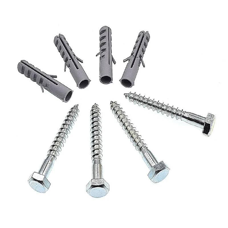 Comprend 4 tirefonds M10 x 80 mm et 4 chevilles.