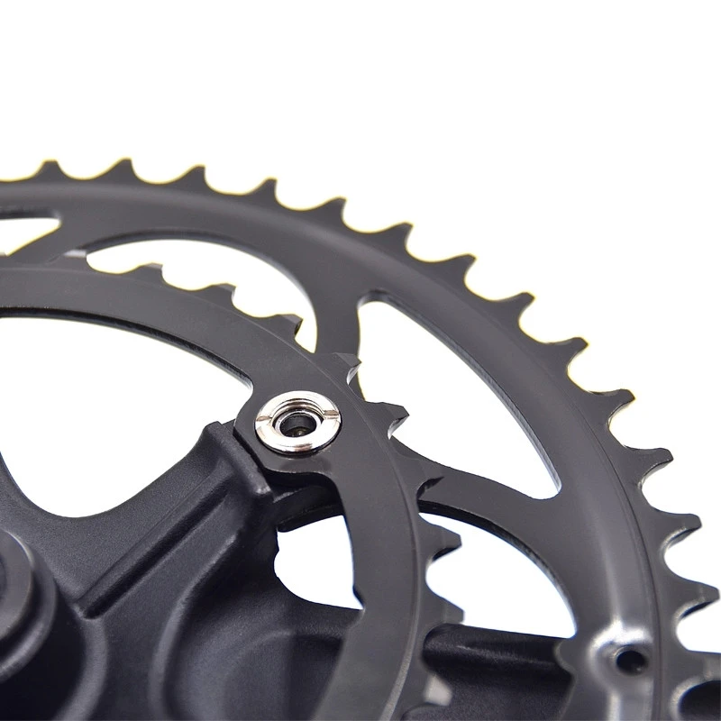 Pédalier Route double plateaux 50-34 dents avec une longueur de manivelle de 175 mm. Vendu avec 2 vis BTR pour pédalier de vélo et cache noir pour protection de pédalier de vélo.