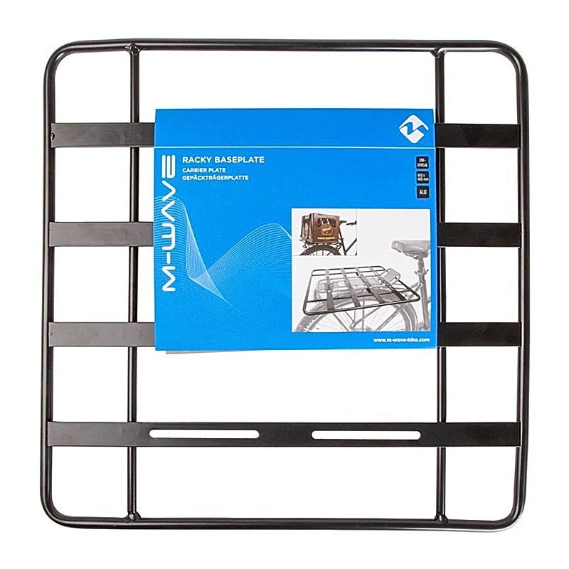 La plaque de support M-Wave Racky en aluminium robuste de couleur noire se fixe sur le porte-bagage arrière vélo afin de permettre de transporter des objets volumineux ou en utilisant une caisse de transport.