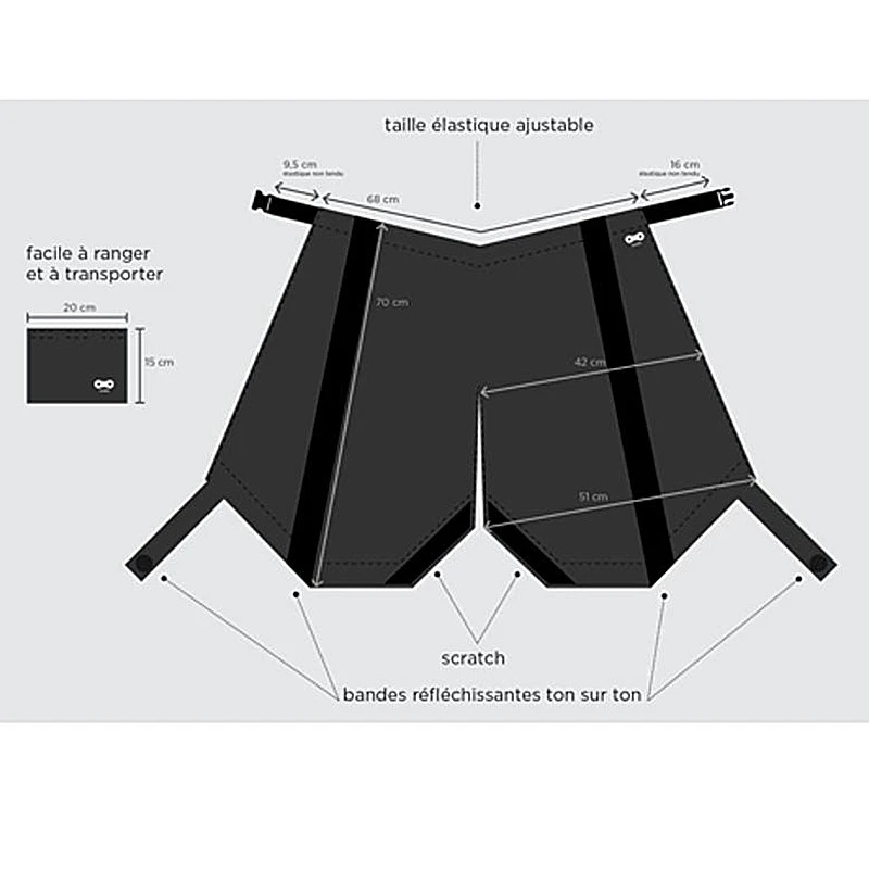 Le panti-pluie se présente sous forme de tablier qui recouvre les cuisses et protège de la pluie à vélo. Il s’accroche dans le dos grâce à une ceinture réglable. Des scratchs au-dessous des genoux permettent une fixation rapide et confortable.