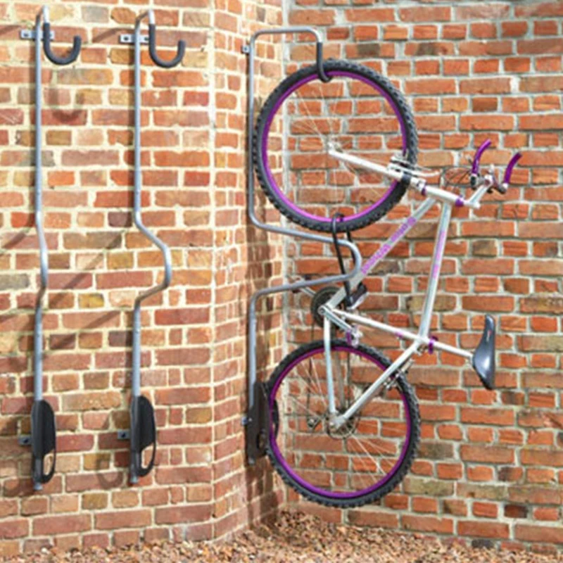 Le range vélo mural individuel avec crochet revêtu de caoutchouc de la marque Mottez permet de suspendre un vélo par la roue avant pendant que la roue arrière reste bloquer dans un sabot, offrant la possibilité d’ajouter un antivol vélo pour sécuriser le rangement du cycle.
