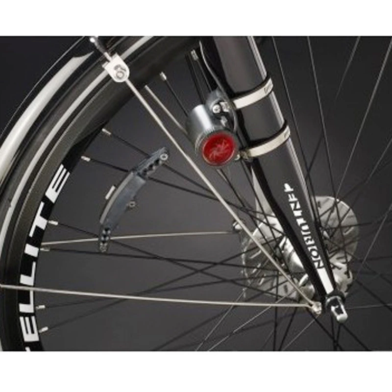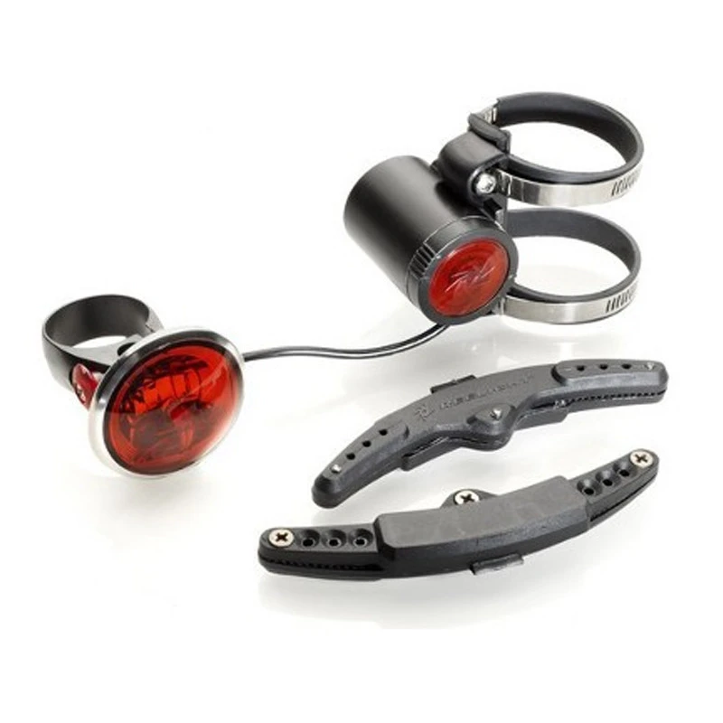 L’éclairage de signalisation arrière SL 520 de la marque Reelight est composé d’un feu arrière qui se fixant sur le guidon, un générateur qui se monte sur la fourche avant à l’aide de 2 aimants pour une fixation rapide sur les rayons du vélo. Facile à mettre en place et très discret, le feu arrière et le générateur sont reliés par un câble noir de petit diamètre facilement dissimulable.
