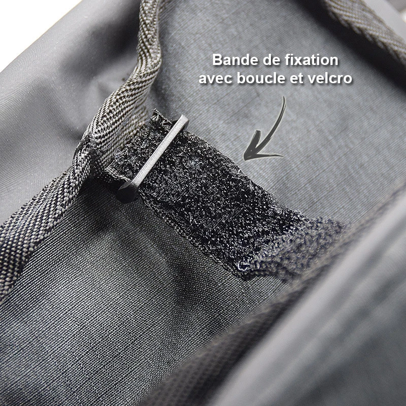 La sacoche étanche de la marque AX Bike se fixe facielement sur les cadres de VTT, VTC et vélo de route au moyen de 3 bandes velcro.