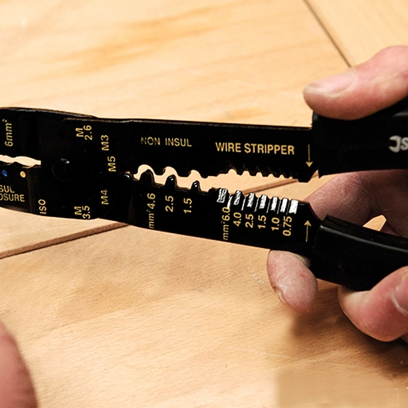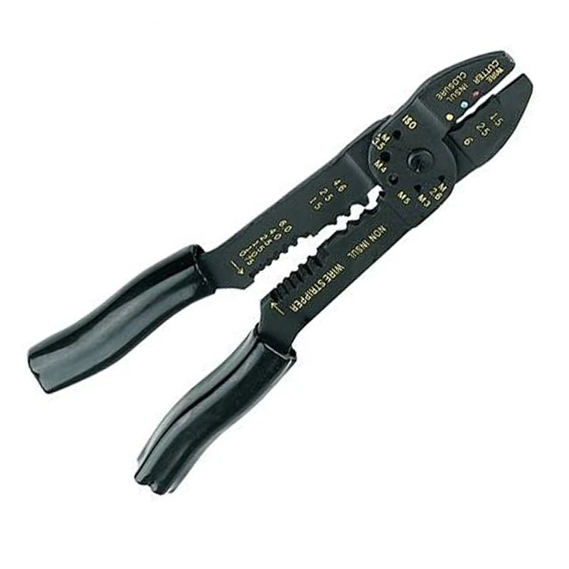 Pince en acier trempé et revenu à arêtes de sertissage et de dénudage. idéal pour les travaux électriques sur vélo, scooter, moto … Pour les cosses pré-isolées. Poignées ergonomiques caoutchoutées.