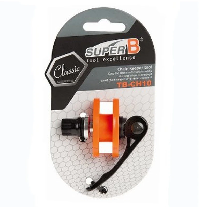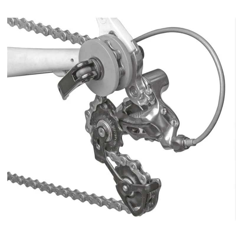 Ce support se place au niveau de votre axe de roue arrière. La roulette orange vous permet de maintenir la chaîne tendue afin d’éviter les traces de cambouis ou de déchirure. Il peut également servir à guider la chaîne pendant des réparations lors du démontage de la roue arrière de votre vélo.