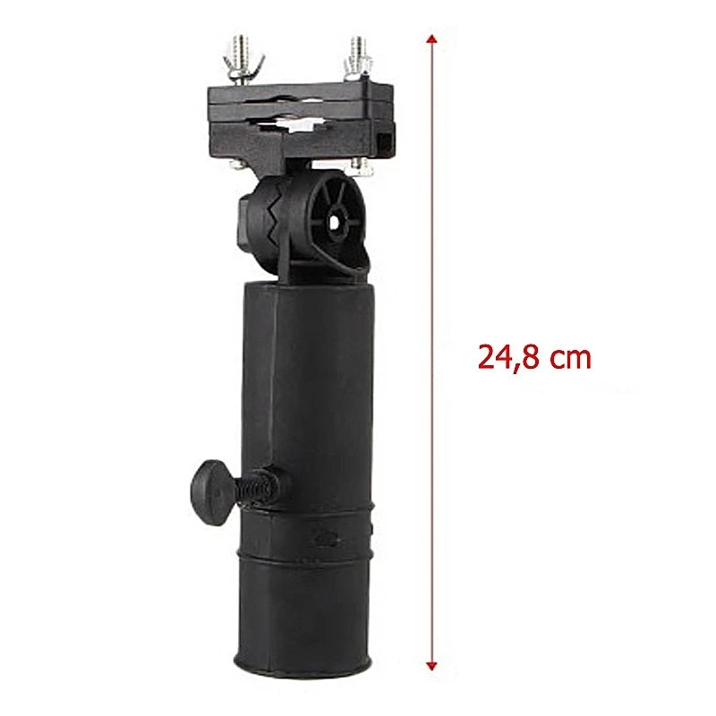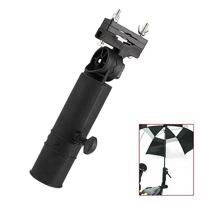 Ce support solide en plastique et résine dispose d’un mécanisme orientable qui se fixe facilement sur le guidon du vélo, sur le chariot de golf, un poussette ou un landau et même sur un fauteuil roulant afin de protéger l’utilisateur du soleil et de la pluie.
